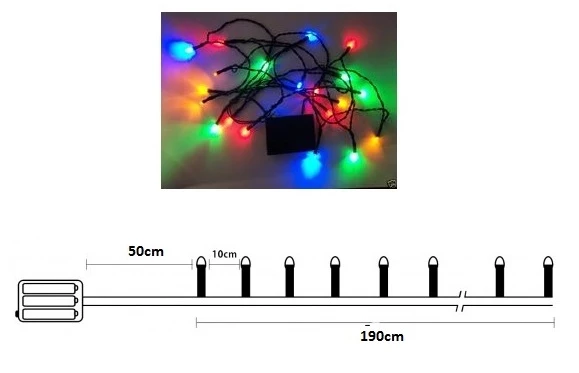 Χριστουγεννιάτικα λαμπάκια μπαταρίας 20L πολύχρωμα με πράσινο καλωδιο 2,4 μέτρα. Με 20 λαμπάκια Η απόσταση ανά λαμπάκι 10 εκ. Εσωτερικού χώρου *Οι μπαταρίες δεν περιλαμβάνονται.