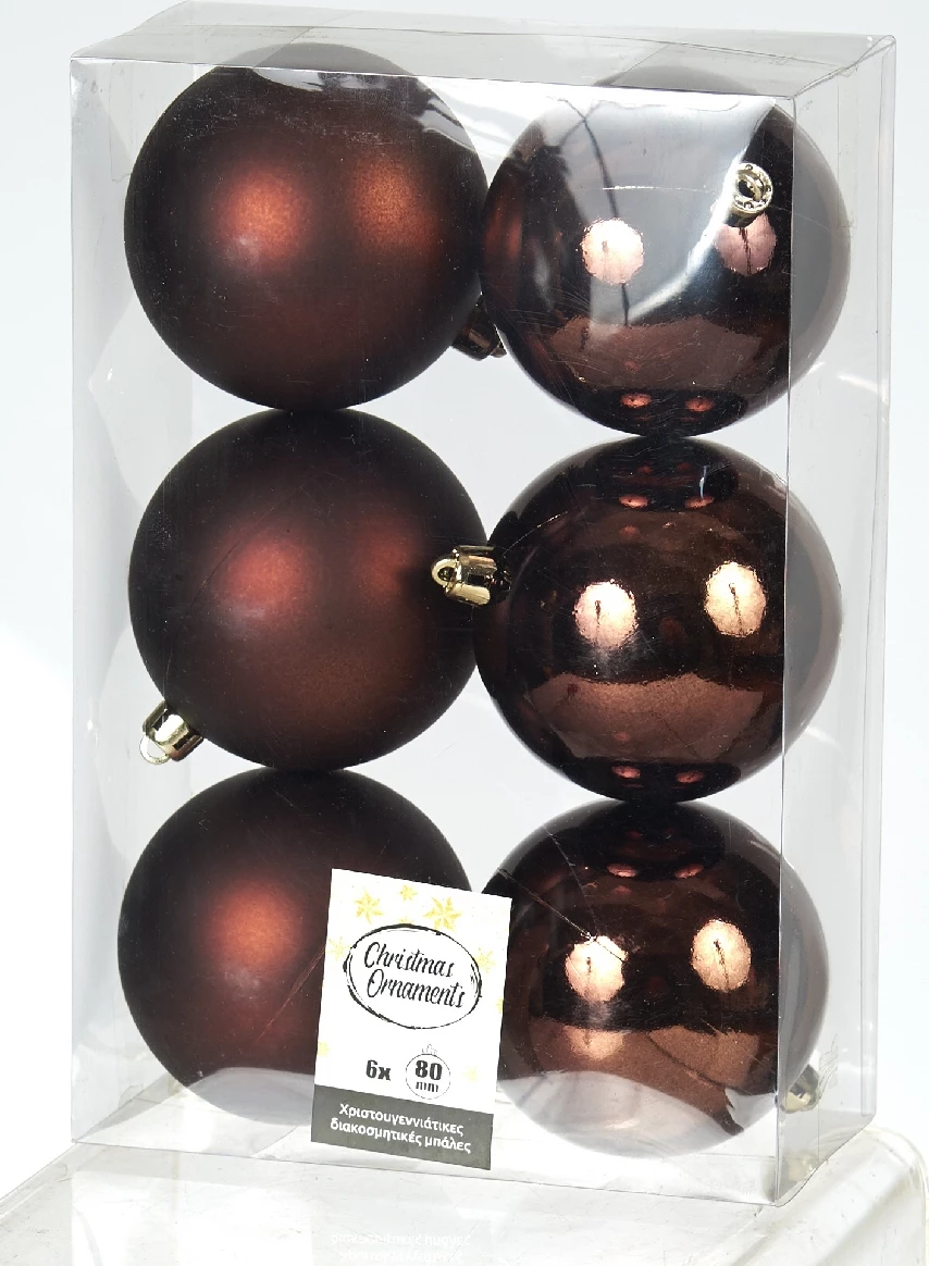 Χριστουγεννιάτικες Μπάλες Πλαστικές Σετ 6 Τεμαχίων Καφέ 8 εκ. • Συσκευασία: 6 τεμάχια (3 Γυαλιστερές / 3 Ματ) • Υλικό: Πλαστικό • Χρώμα: Καφέ • Διάμετρος: 8 εκ.