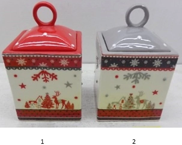Χριστουγεννιάτικη Κεραμική Μπισκοτιέρα Τετράγωνη Υλικό: Κεραμικό Χρώμα: Λευκό – Κόκκινο και Λευκό – Γκρι Διαστάσεις: Μ:9 Π:9 Υ:18 εκ. Σχέδιο: Τετράγωνο