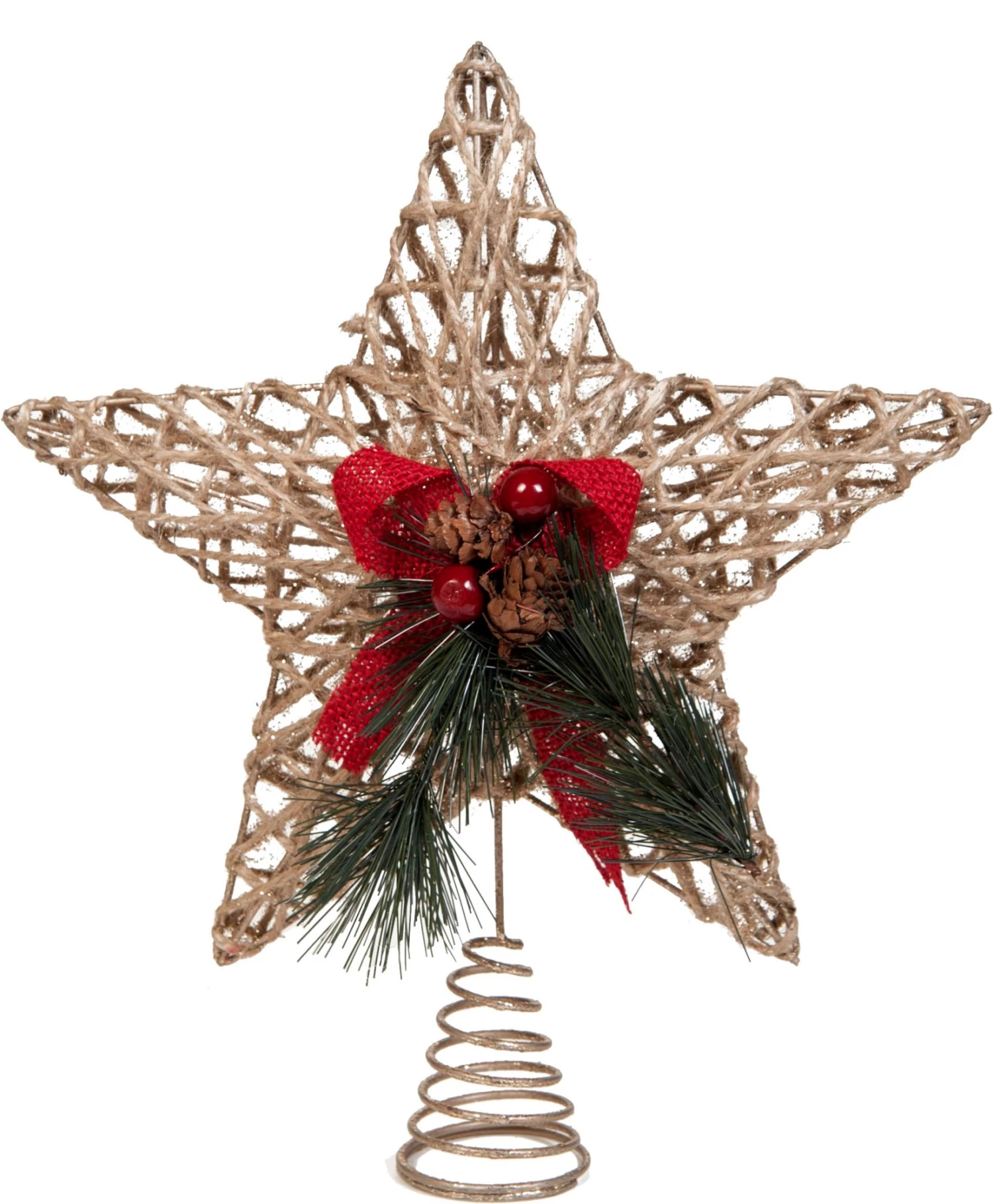 Χριστουγεννιάτικη κορυφή δέντρου χρυσή με αστέρι και κόκκινο φιόγκο 32 εκατοστά Χαρακτηριστικά: •Ύψος: 32 εκ. •Υλικό: Σιδερένιο με κλωστή λινάτσας •Χρώμα: Χρυσό/Μπεζ