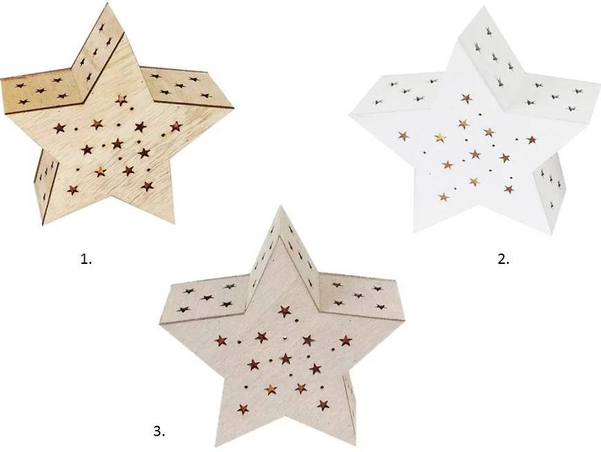Χριστουγεννιάτικο ξύλινο αστέρι με φώς 12x12x5.5εκ 3 χρώματα Ξύλινο Χριστουγεννιάτικο αστέρι με φως LED για Χριστουγεννιάτικη διακόσμηση εσωτερικού χώρουΤο προϊόν διατίθεται σε διάφορα σχέδια ή χρώματα. Η επιλογή γίνεται τυχαία. ΠΩΛΟΥΝΤΑΙ ΞΕΧΩΡΙΣΤΑ