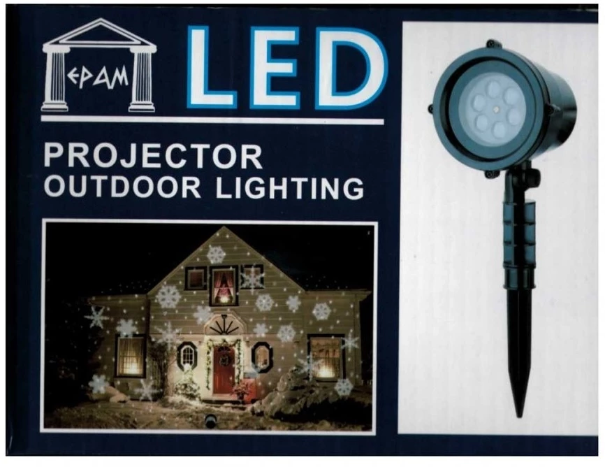 Χριστουγεννιάτικος προτζέκτορας αλουμινίου με σχέδιο λευκές νιφάδες. Απόσταση εκπομπής:15 μέτρα Ακτίνα: 6×6 μέτρα Τοποθετείται είτε στο έδαφος με την ειδική ράβδο είτε σταθεροποιείται στη βάση του.